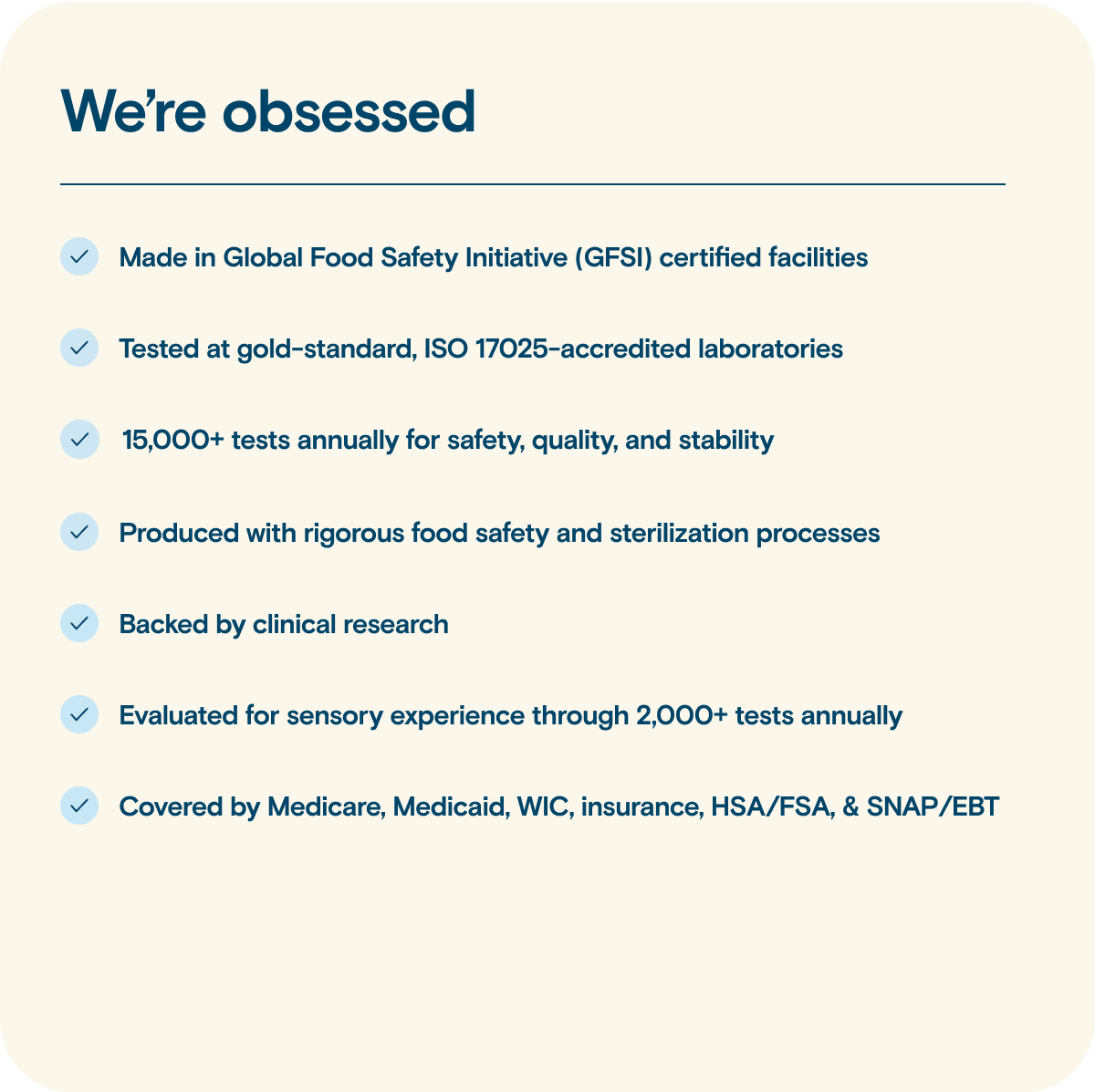 We believe that when everyone’s health needs are met, human potential flourishes. Since our founding in 2012, we’ve continued to push for policy change and advocate for broader insurance coverage so that every person can get the good nutrition they deserve. Today, our nutrition is in 1,400+ hospitals and has nourished over half a million people. And we’re just getting started.