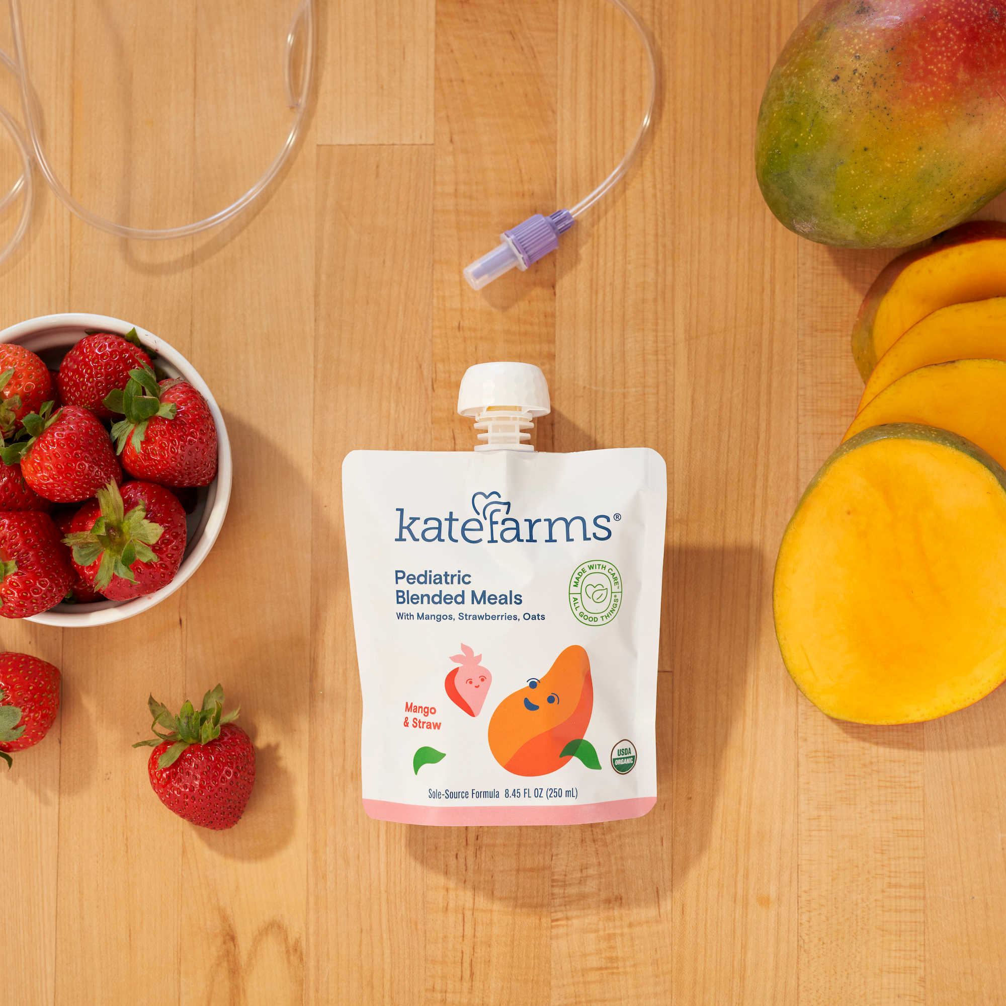 Instructions on how to administer Kate Farms Pediatric Blended Meals with our direct-to-tube connection packaging.