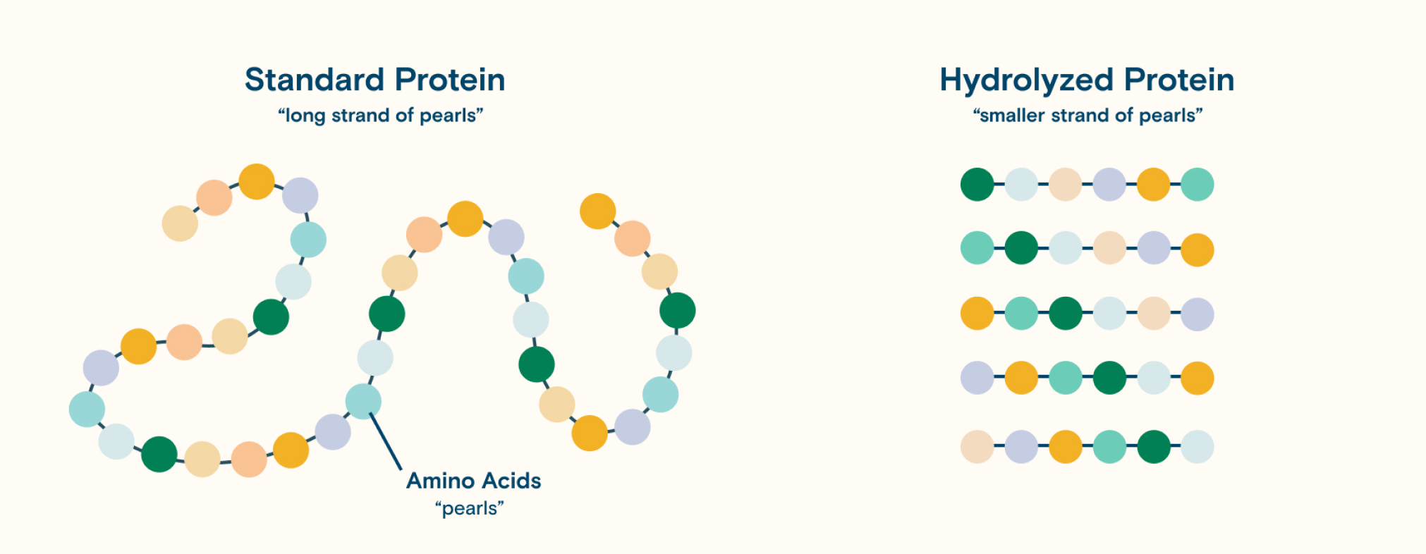 To understand peptide nutrition, let’s start with the basics of protein. Protein helps repair and build cells, and it’s an important component for growth and development. Nutrition formulas contain protein in various forms: intact (standard formulas), hydrolyzed (peptide formulas), and elemental. We like to use a metaphor of a string of pearls to explain the difference between our intact and hydrolyzed protein formulas. In an elemental formula (which may be recommended if a peptide formula is not tolerated), the protein is completely broken down into its simplest form: individual amino acids, or “pearls.”
