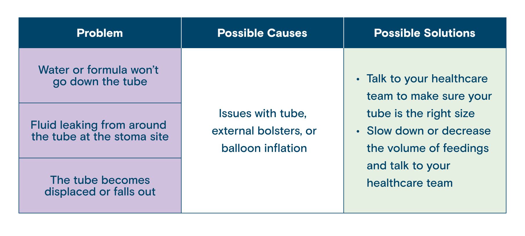 If you or your loved one has redness, pain, swelling, or irritation of the skin around the tube, please let your healthcare team know. Possible causes could be that the tube or external bolster are too tight or loose, that the cleaners you’re using to clean the tube are too harsh, or you could potentially be experiencing a bacterial or yeast infection.